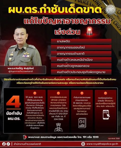 วันที่ 11 กุมภาพันธ์ 2568 ผบ.ตร. กำชับ ตามที่ รัฐบาล และ ตร. มีนโยบายเร่งด่วนในการแก้ไขปัญหายาเสพติด ปัญหาอาชญากรรมออนไลน์ อาชญากรรมข้ามชาติ คนต่างด้าวหลบหนีเข้าเมืองโดยผิดกฎหมาย และคนต่างด้าวถูกหลอกลวงหรือประกอบธุรกิจผิดกฎหมายซึ่ง ตร. ได้มีมาตรการให้หน่วยปฏิบัติตามนัยหนังสือ ตร. ด่วนที่สุด ที่ ๐๐๐๗.๓๓/๓๑๖ ลง ๒๓ ม.ค.๖๘ ตลอดจนการป้องกันปราบปรามคนต่างด้าวที่เข้ามาในลักษณะ ที่แอบแฝงหรือกระทำความผิดในลักษณะที่เป็นภัยต่อสังคม หรือจะก่อเหตุร้ายให้เกิดอันตรายต่อความสงบสุขหรือความปลอดภัยของประชาชน หรือความมั่นคงแห่งราชอาณาจักร อันส่งผลต่อภาพลักษณ์หรือประสิทธิภาพในการบังคับใช้กฎหมายของสังคมโดยรวม จึงกำชับให้ทุกหน่วยดำเนินการ ดังนี้