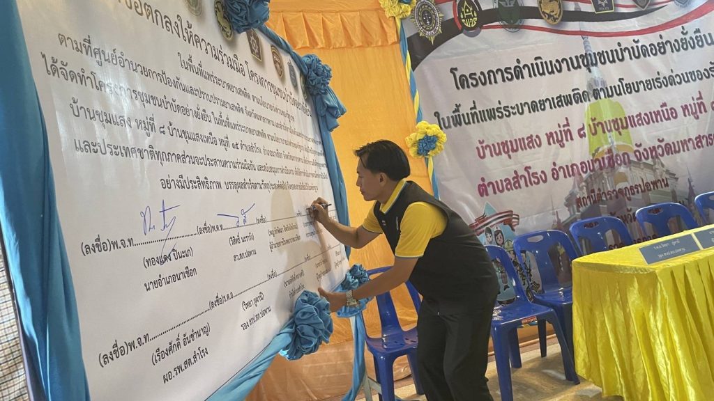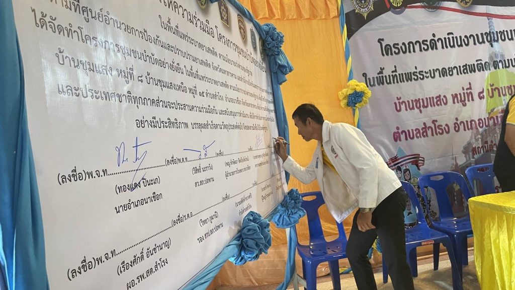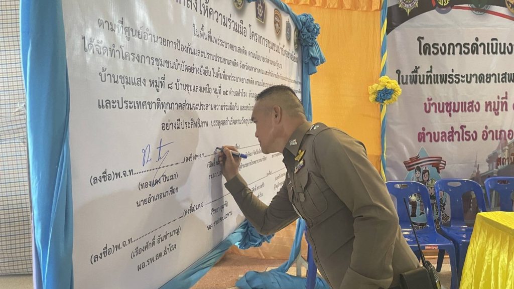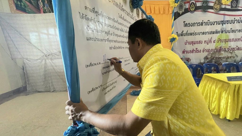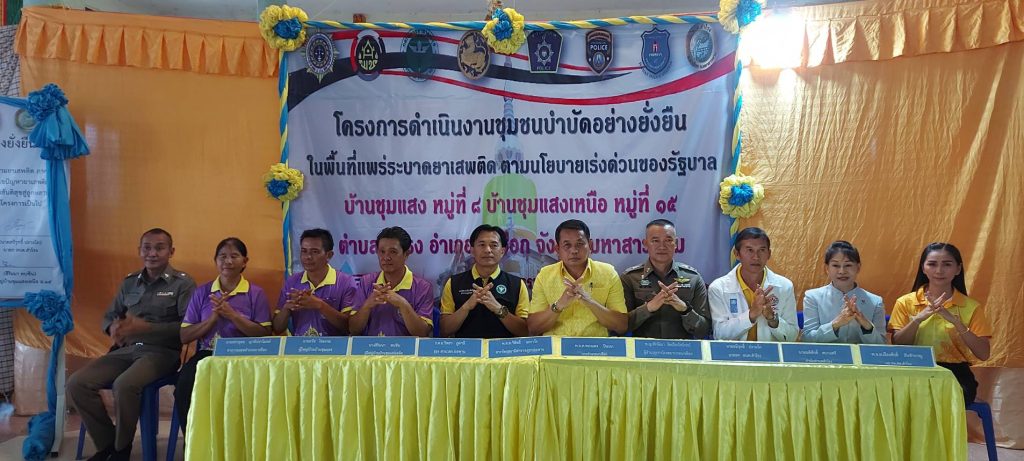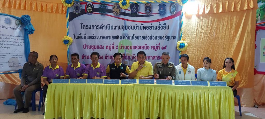 ทั้งนี้ หัวหน้าส่วนราชการ, ผู้นำชุมชน ได้ร่วมกันลงนาม MOU และสุ่มตรวจปัสสาวะ หาสารเสพติด ผู้นำชุมชน ,ชาวบ้านชุมแสง หมู่ 8 และบ้านชุมแสงเหนือ หมู่ 15 และมีผู้สมัครใจบำบัดในวันเปิดโครงการชุมชนบำบัดยั่งยืนฯ จำนวน 20 ราย
