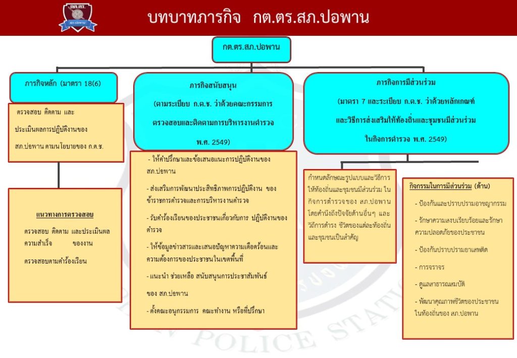 7) ปฏิบัติหน้าที่อื่นตามที่คณะรัฐมนตรีมอบหมายหรือตามที่มึกฎหมายกำหนด และยังคงให้มีกรรมการตรวจสอบและติดตามการบริหารงานตำรวจกรุงเทพมหานคร จังหวัดและสถานีตำรวจอยู่ โดยกำหนดให้เป็นองค์กรที่มีอำนาจหน้าที่ตรวจสอบ ติดตามและประเมินผลการปฏิบัติงานตามนโยบายการบริหารงานตำรวจของข้าราชการตำรวจในเขตพื้นที่แล้วรายงาน ก.ต.ช. เพื่อพิจารณาดำเนินการตามควรแก่กรณี ซึ่งแตกต่างไปจากอำนาจหน้าที่เดิม ส่วนแนวคิดในการกำหนดองค์ประกอบและอำนาจหน้าที่ของ กต.ตร.กทม. จังหวัด และสถานีตำรวจ ยังคงให้เป็นองค์กรที่ให้ประชาชนมีส่วนร่วม โดยเปิด โอกาสให้กับประชาชนในชุมชนและหมู่บ้านกว้างมากขึ้น ทั้งต้องการให้เป็นองค์กรที่มีบทบาทตามนัยมาตรา 7 แห่ง พ.ร.บ.ตำรวจแห่งชาติด้วย รวมตลอดทั้งให้มีความเชื่อมโยงกับองค์กรปกครองส่วนท้องถิ่น ทั้งนี้เพื่อให้สอดรับกับระบบการบริหารราชการของประเทศ (ตาม พ.ร.บ.กำหนดแผนและขั้นตอนการกระจายอำนาจให้แก่องค์กรปกครองส่วนท้องถิ่น พ.ศ. 2542 กำหนดให้กรุงเทพมหานคร องค์การบริหารส่วนจังหวัด เทศบาล เมืองพัทยา และองค์การบริหารส่วนตำบลมีอำนาจและหน้าที่ในการจัดระบบการบริการสาธารณะเพื่อประโยชน์ของประชาชนในท้องถิ่นของตนเองในเรื่องการรักษาความสงบเรียบร้อย การส่งเสริมและสนับสนุนการป้องกันและรักษาความปลอดภัยในชีวิตและทรัพย์สินอยู่ด้วย) ดังนั้นในการกำหนดองค์ประกอบของ กต.ตร. ในปัจจุบันจึงกำหนดให้มีสัดส่วนของประชาชนในชุมชน/หมู่บ้านมากขึ้น ตลอดจนกลุ่มอาชีพต่าง ๆ ที่เป็นผู้ใช้บริการของตำรวจ พร้อมทั้งให้ผู้บริหารส่วนท้องถิ่นเข้าร่วมเป็นกรรมการด้วย โดยเฉพาะอย่างยิ่งในระดับสถานีตำรวจยังเปิดโอกาสให้ประชาชนหรือผู้บริหารส่วนท้องถิ่นสามารถเป็นประธาน กต.ตร.สถานีตำรวจได้